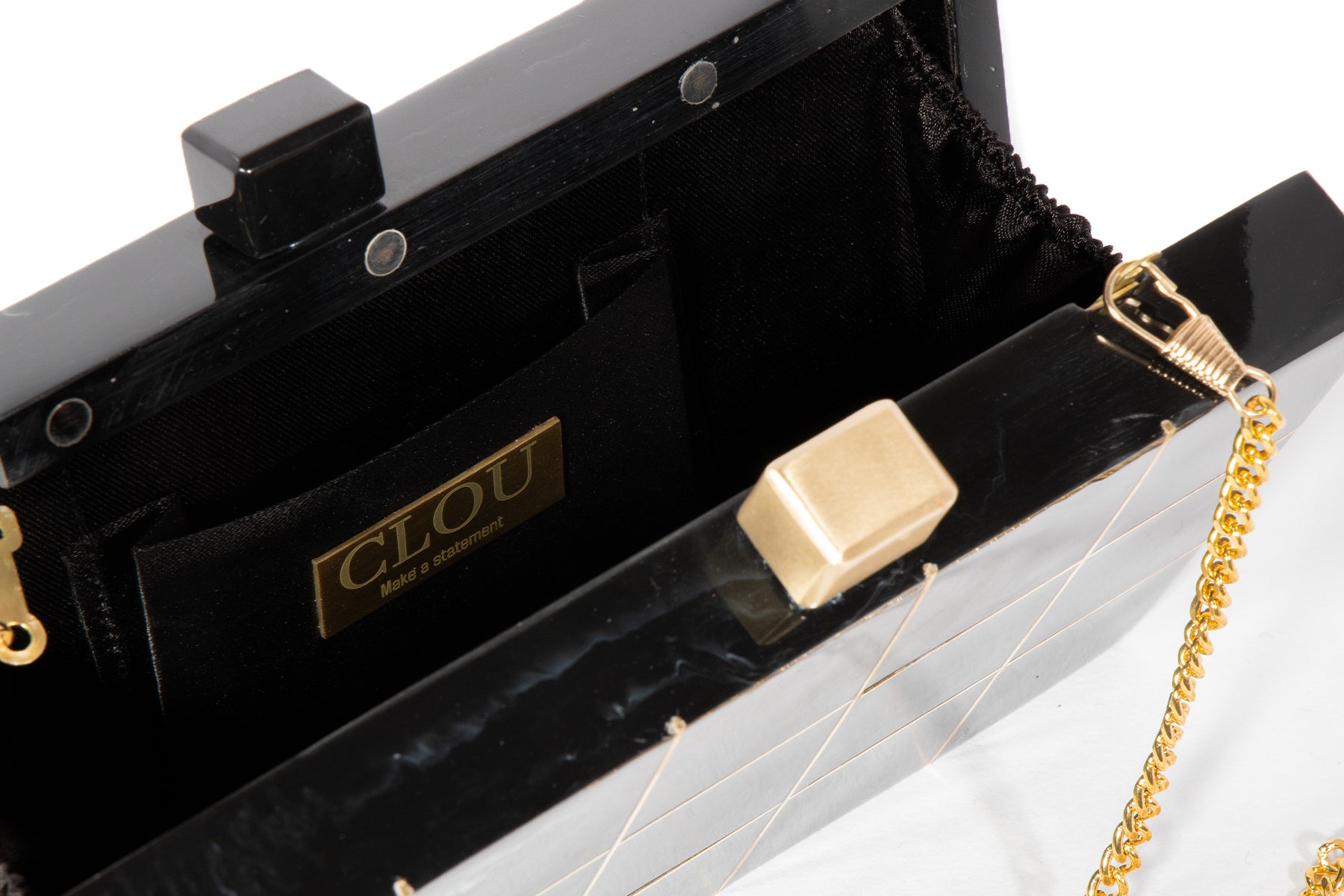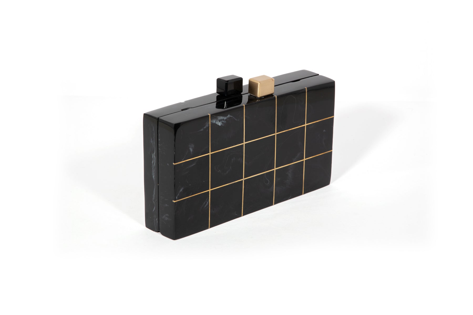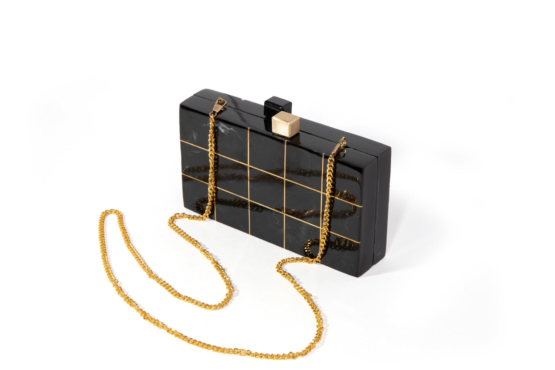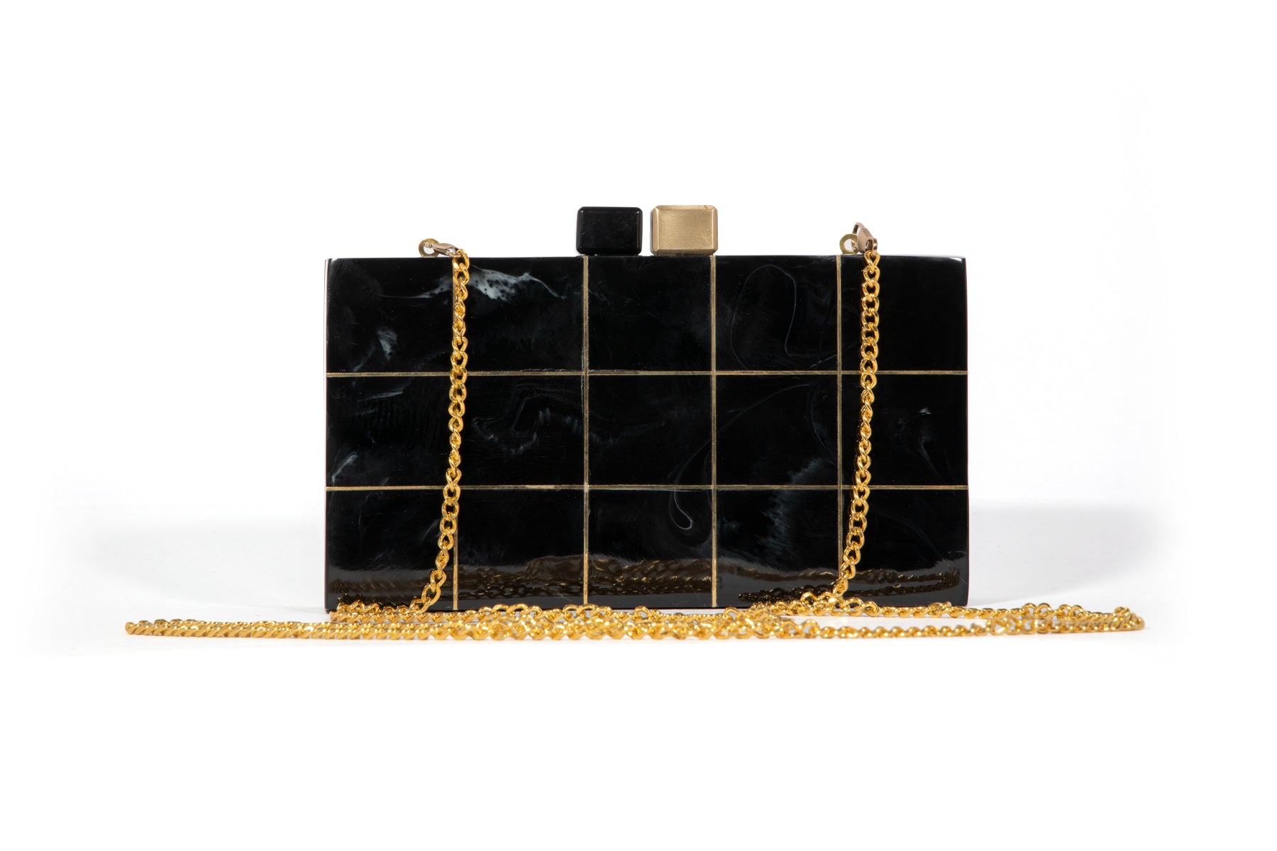 Elevate your style with this stunning black resin clutch, featuring striking inlay brass stripes and a chic black and white button closure. This show-stopping designer clutch is a true masterpiece, renowned for its dreamy and catchy design. If you're looking for a statement piece that goes beyond the ordinary, this clutch is perfect for you. Its bold and eye-catching aesthetic ensures a fashion-forward look that's sure to turn heads. Whether you're attending a glamorous event or simply want to add some excitement to your everyday look, this clutch is the ultimate accessory for those who dare to be different.