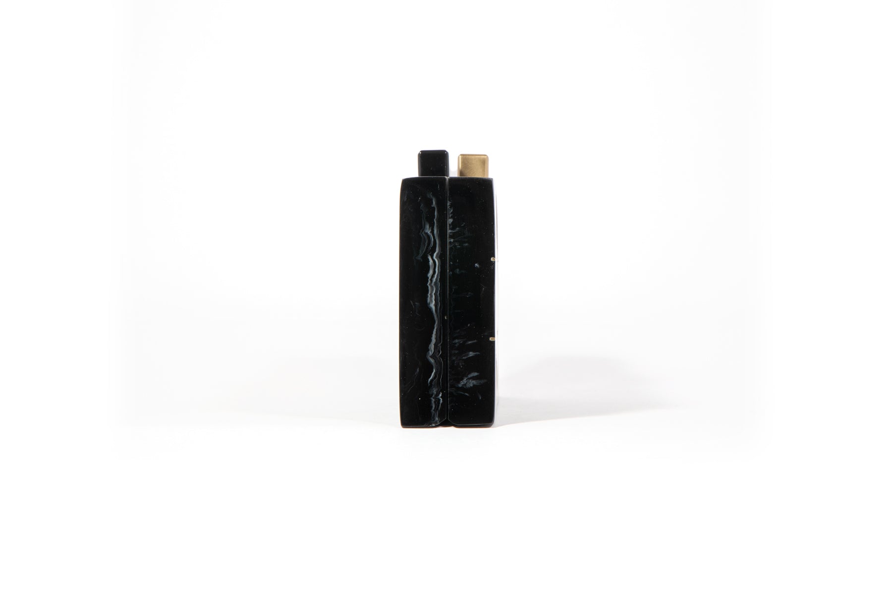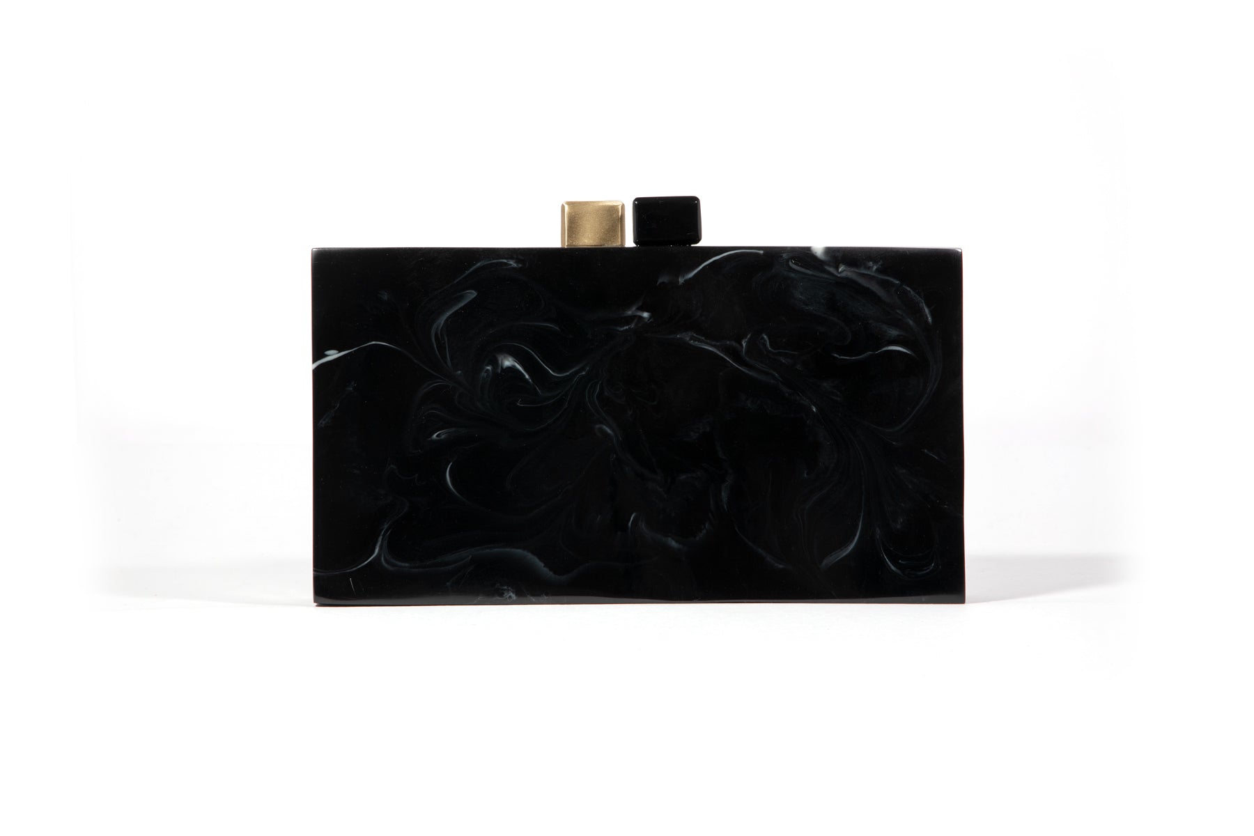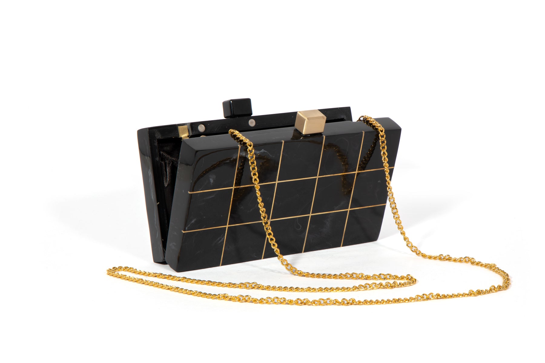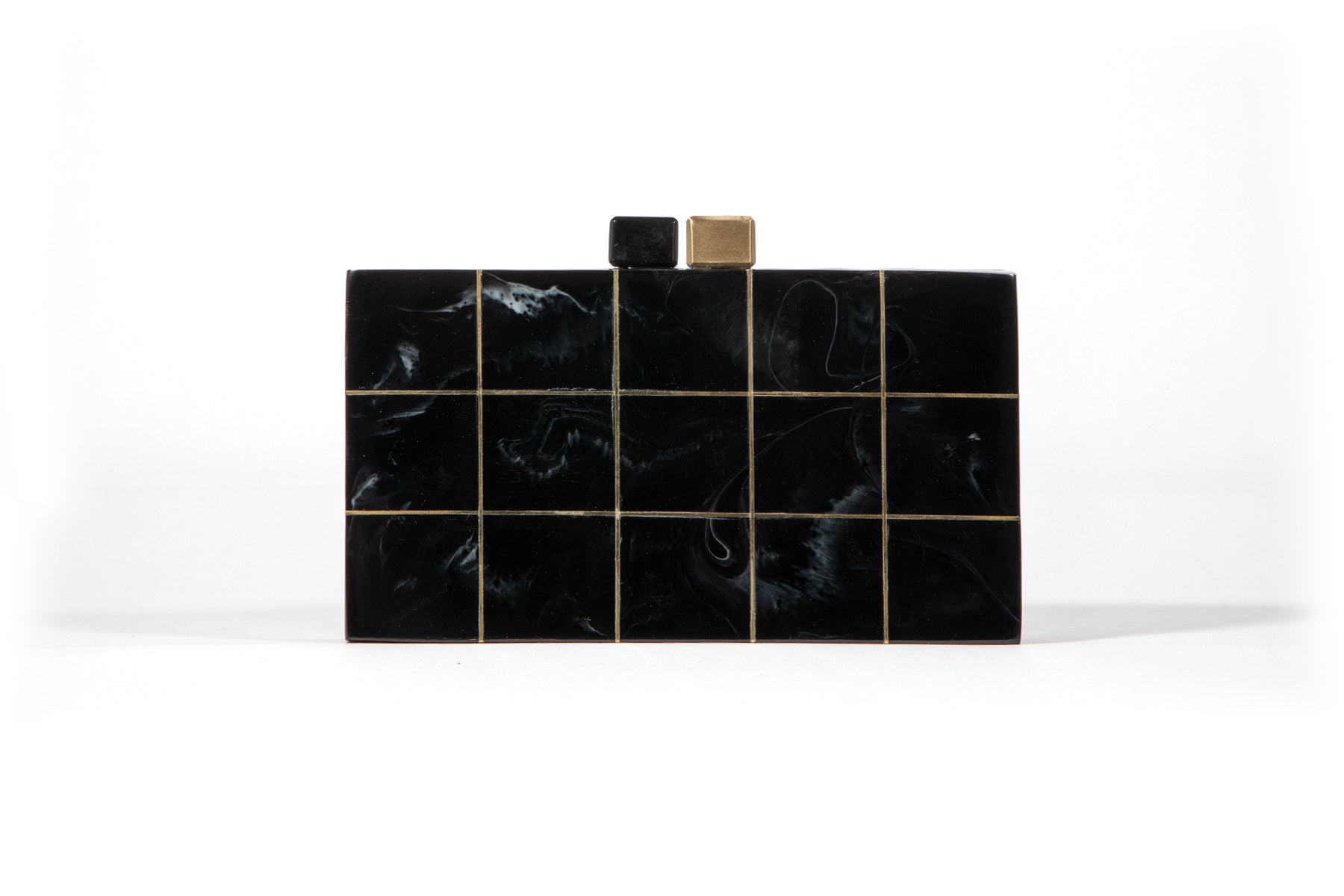 Elevate your style with this stunning black resin clutch, featuring striking inlay brass stripes and a chic black and white button closure. This show-stopping designer clutch is a true masterpiece, renowned for its dreamy and catchy design. If you're looking for a statement piece that goes beyond the ordinary, this clutch is perfect for you. Its bold and eye-catching aesthetic ensures a fashion-forward look that's sure to turn heads. Whether you're attending a glamorous event or simply want to add some excitement to your everyday look, this clutch is the ultimate accessory for those who dare to be different.