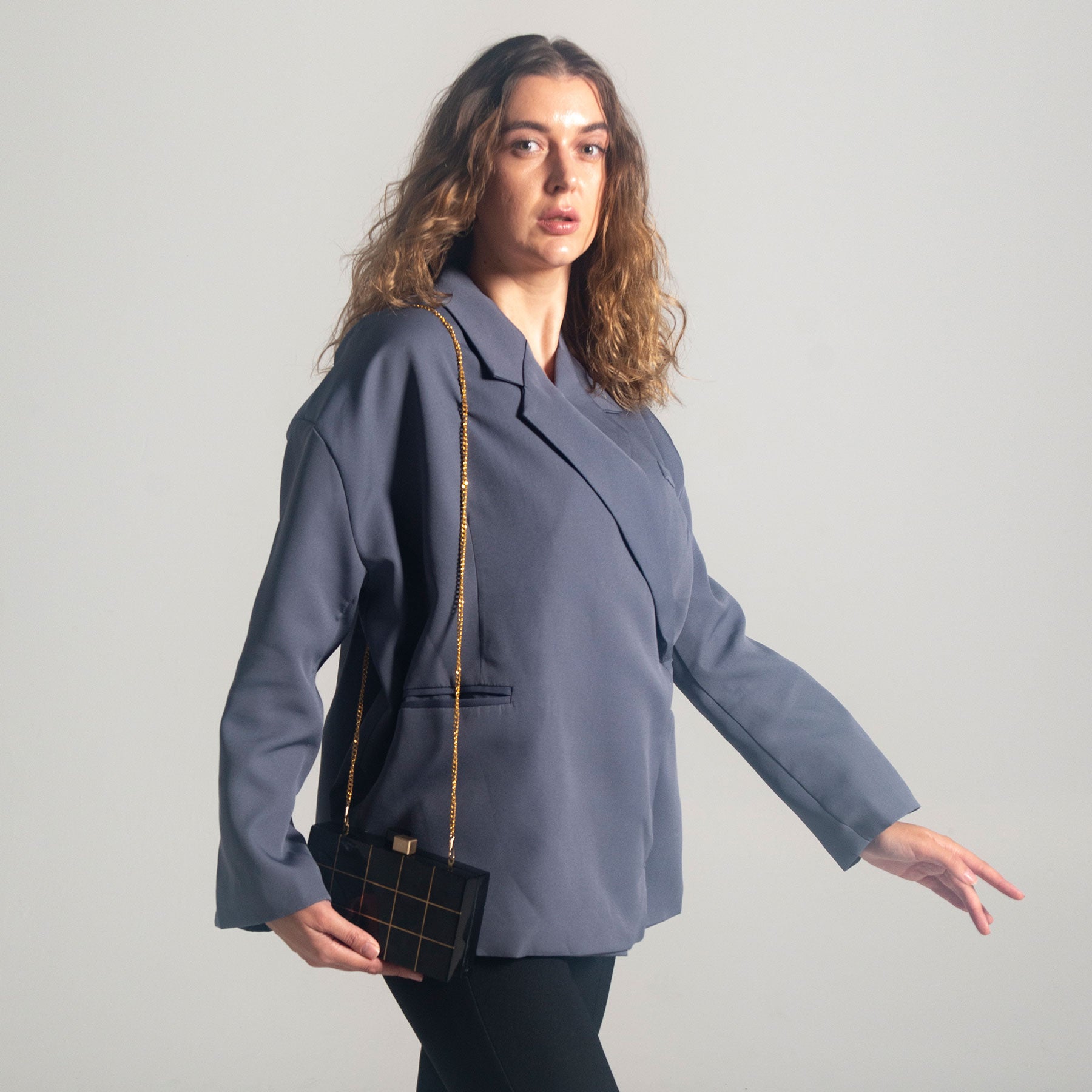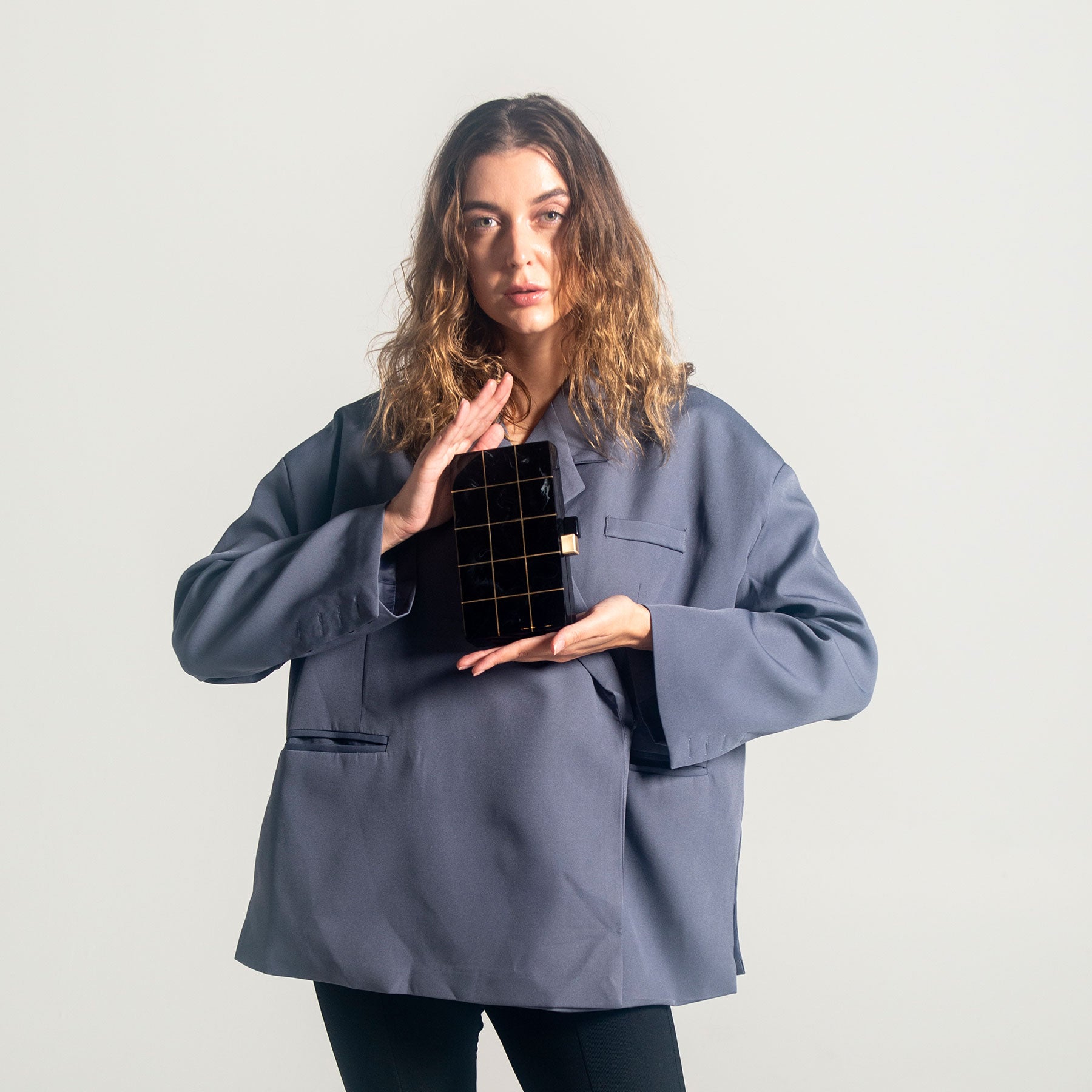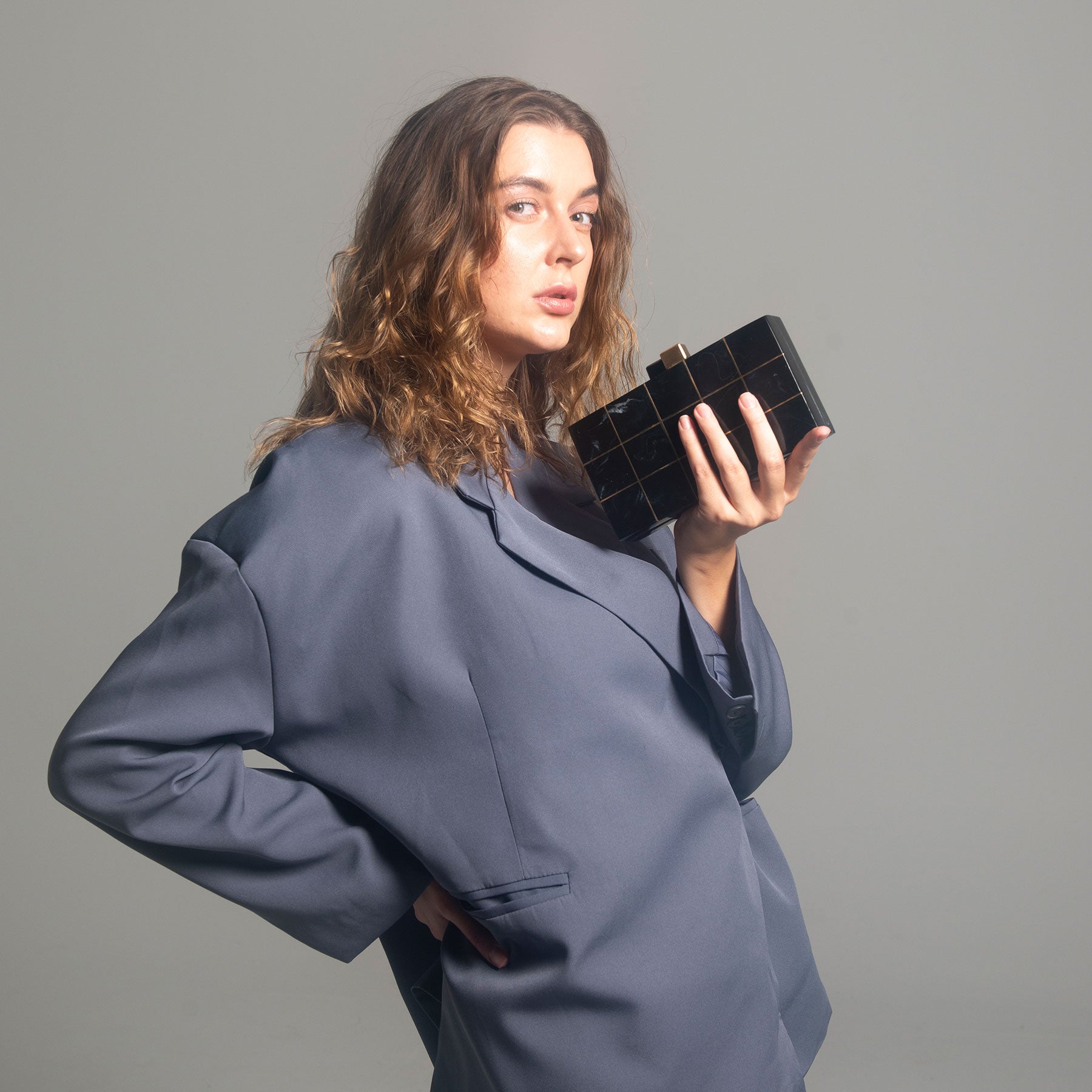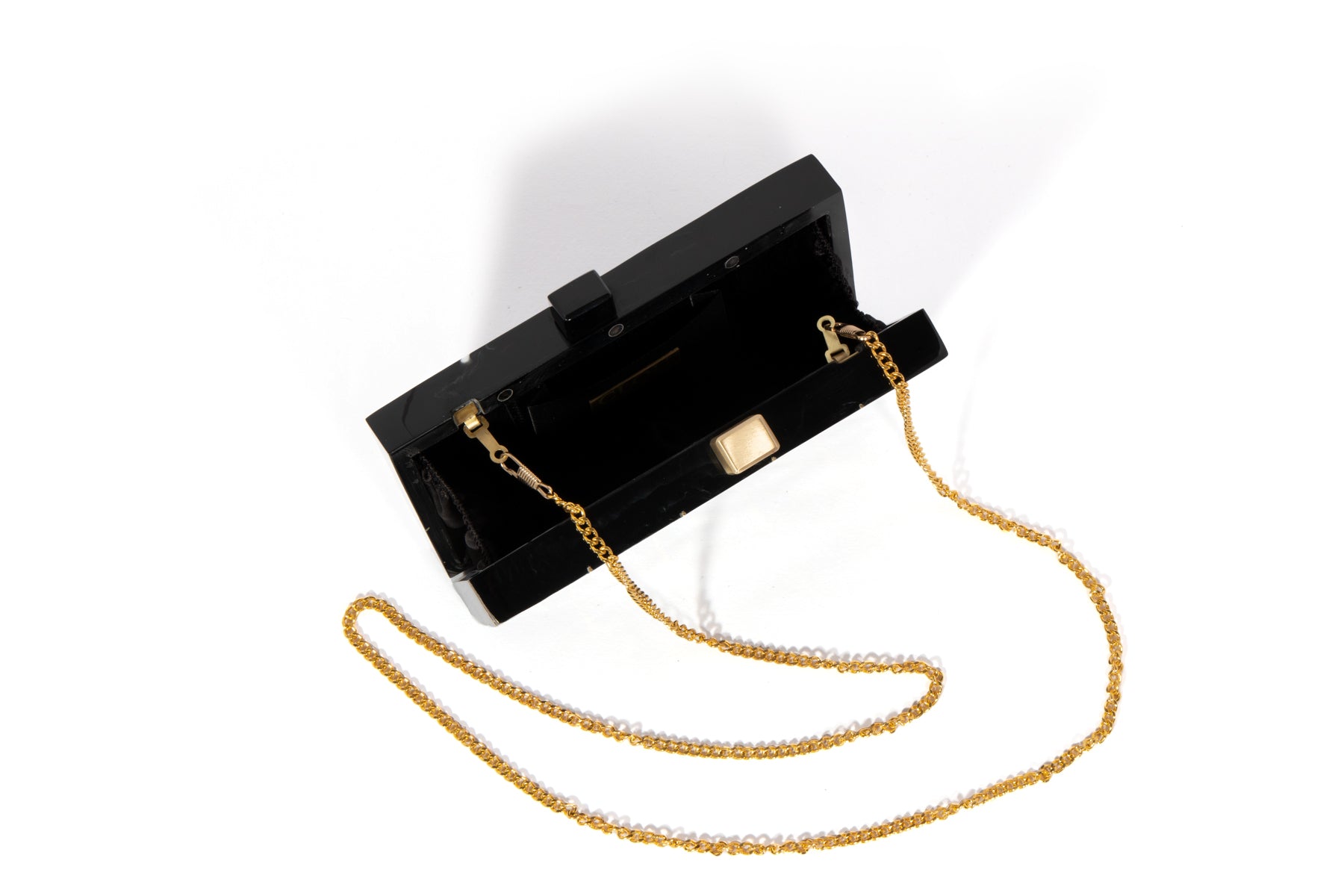 Elevate your style with this stunning black resin clutch, featuring striking inlay brass stripes and a chic black and white button closure. This show-stopping designer clutch is a true masterpiece, renowned for its dreamy and catchy design. If you're looking for a statement piece that goes beyond the ordinary, this clutch is perfect for you. Its bold and eye-catching aesthetic ensures a fashion-forward look that's sure to turn heads. Whether you're attending a glamorous event or simply want to add some excitement to your everyday look, this clutch is the ultimate accessory for those who dare to be different.