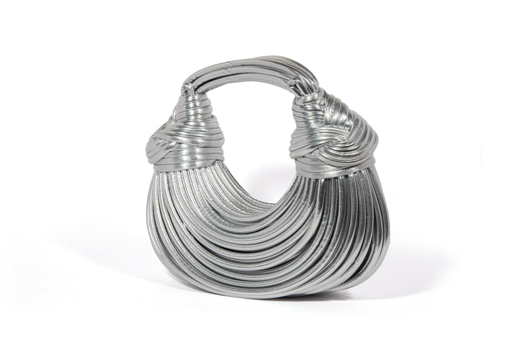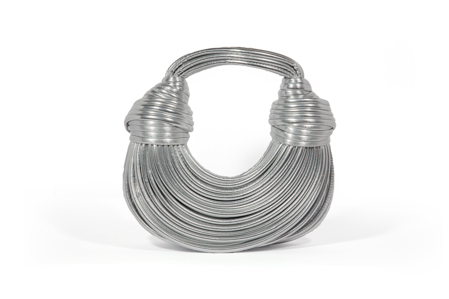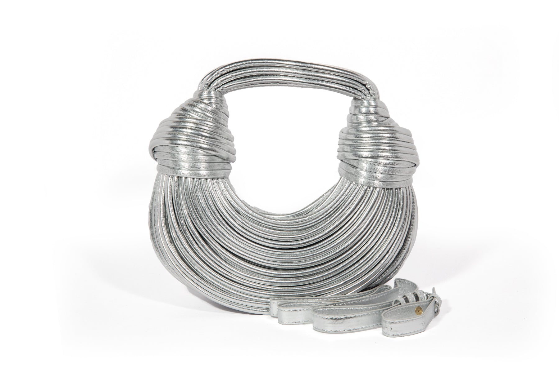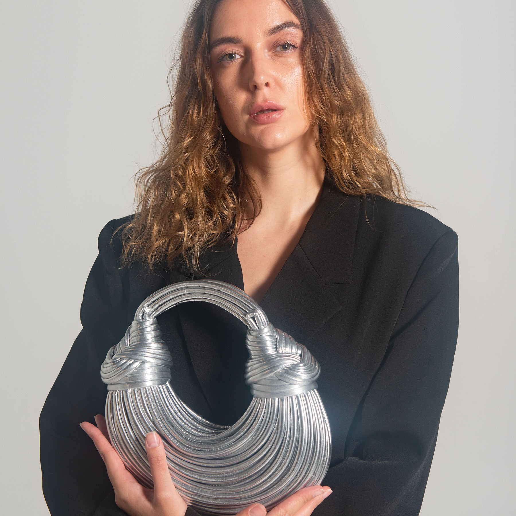 Experience the perfect fusion of sophistication and durability with this exquisite handbag, expertly crafted from premium vegan and cruelty-free leather. More than just a practical accessory, it's a bold fashion statement that exudes luxury and style. The designer's touch is evident in the intricate knotted detailing, setting this piece apart as the ultimate choice for the modern woman. Elevate your look for date night or everyday sophistication with this stunning handbag, available in sleek silver and golden hues. Its seamless blend of high-quality materials and chic design makes it the perfect companion for any occasion.