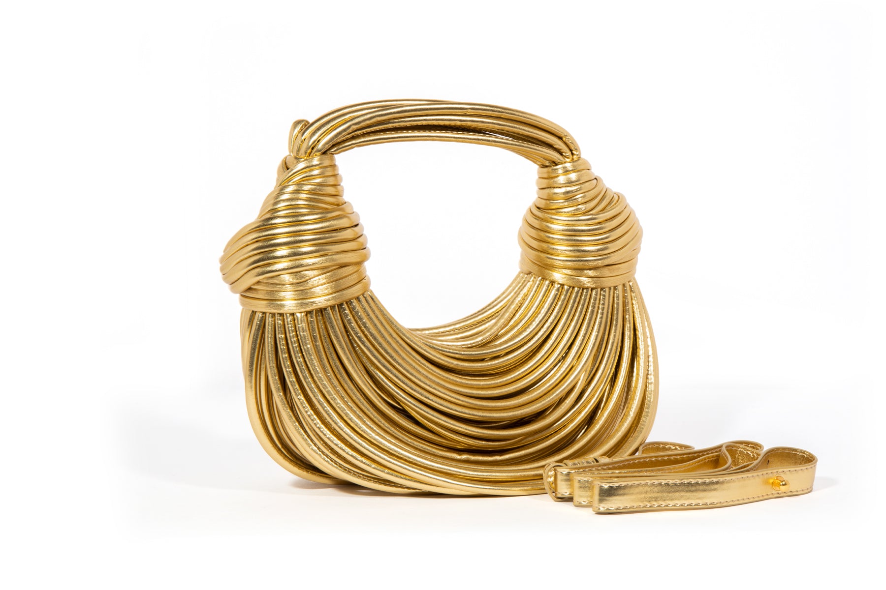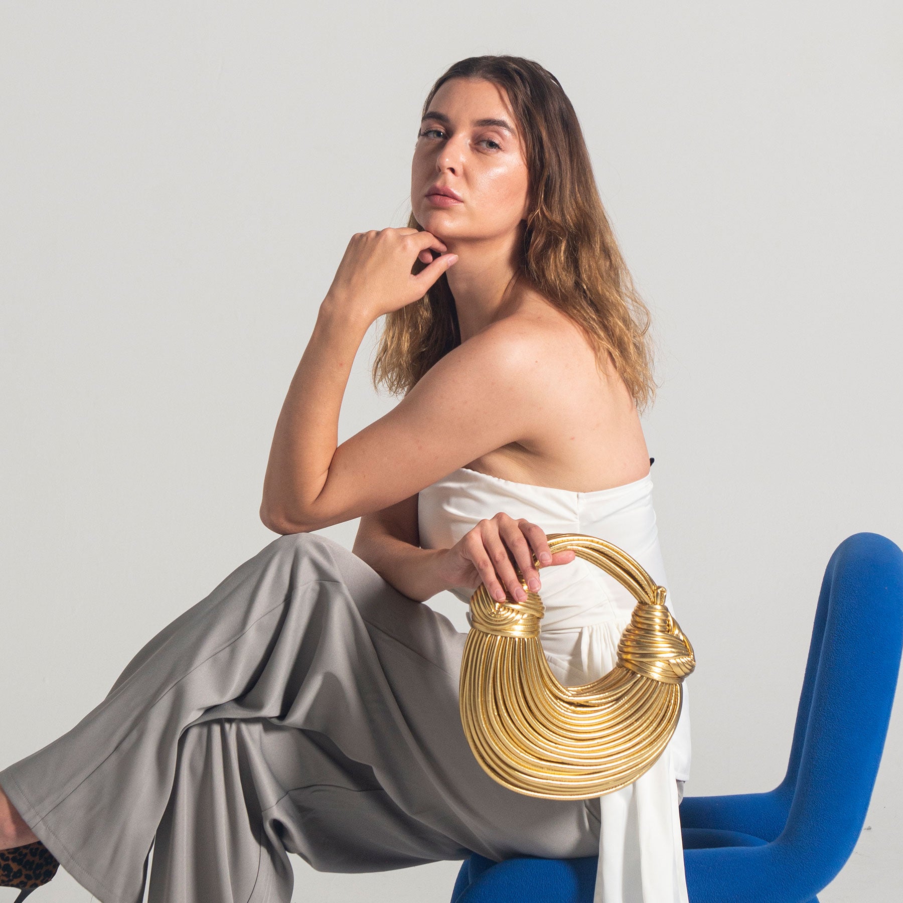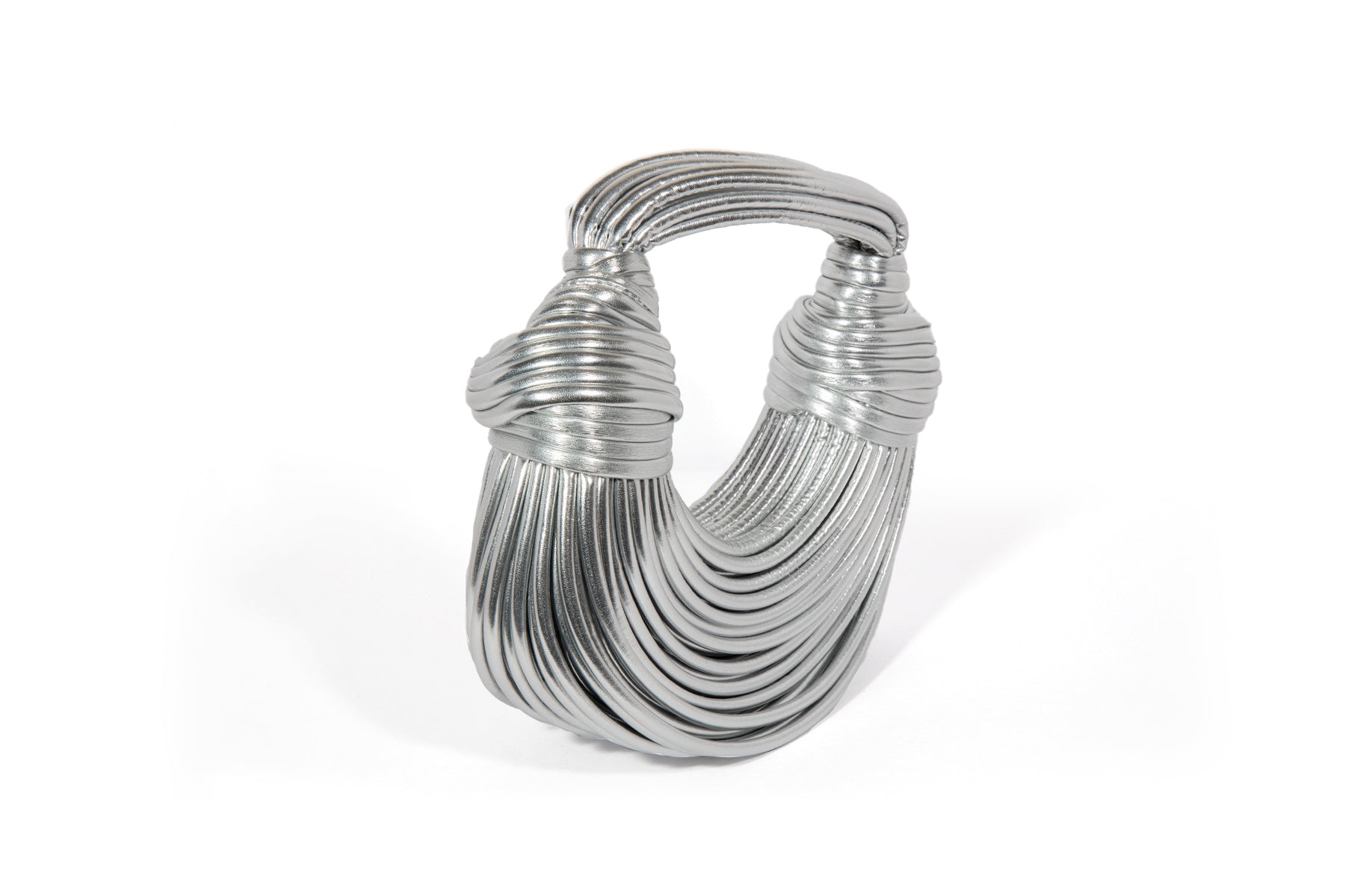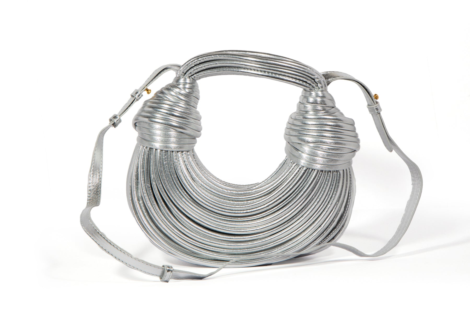 Experience the perfect fusion of sophistication and durability with this exquisite handbag, expertly crafted from premium vegan and cruelty-free leather. More than just a practical accessory, it's a bold fashion statement that exudes luxury and style. The designer's touch is evident in the intricate knotted detailing, setting this piece apart as the ultimate choice for the modern woman. Elevate your look for date night or everyday sophistication with this stunning handbag, available in sleek silver and golden hues. Its seamless blend of high-quality materials and chic design makes it the perfect companion for any occasion.