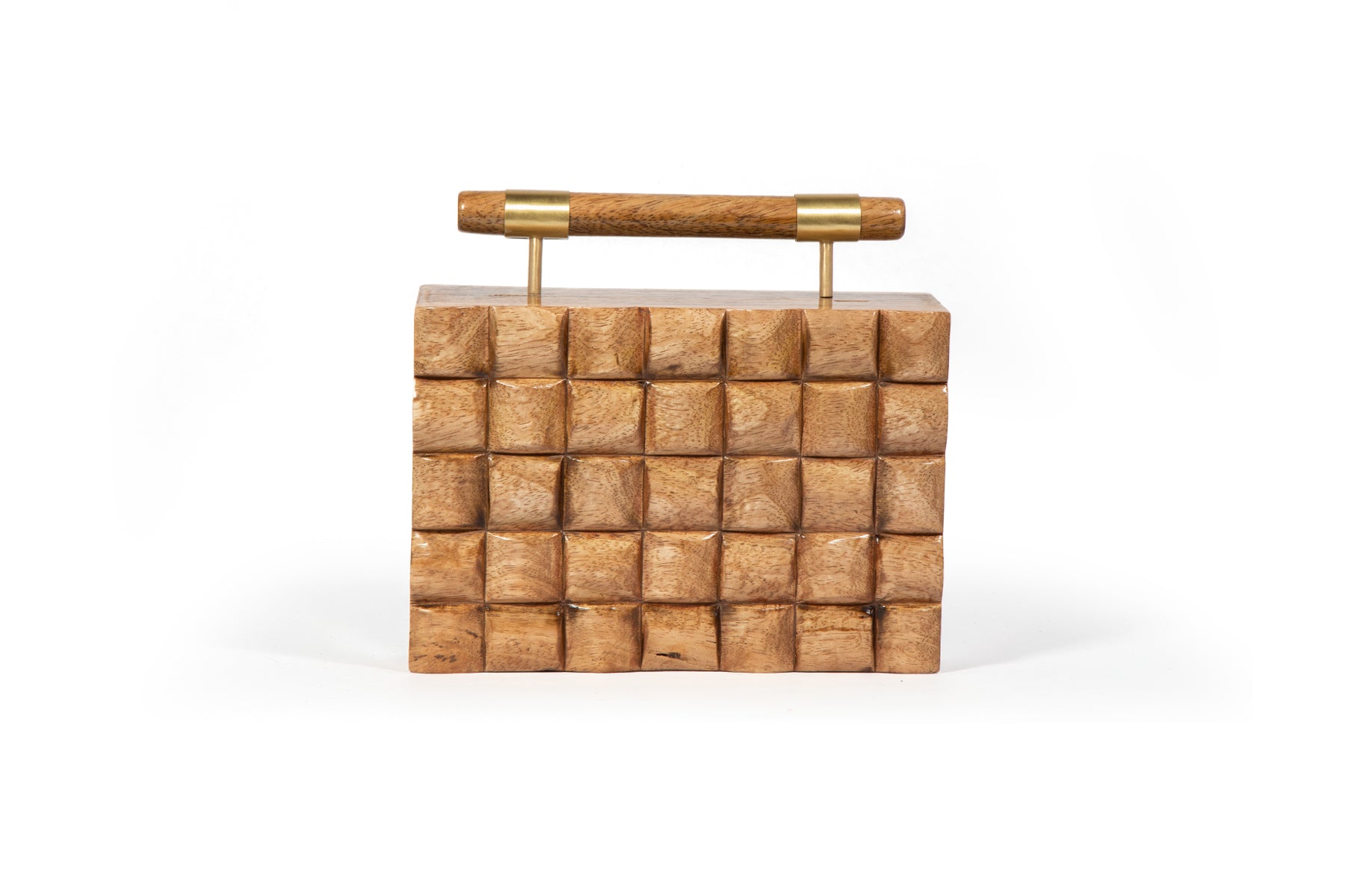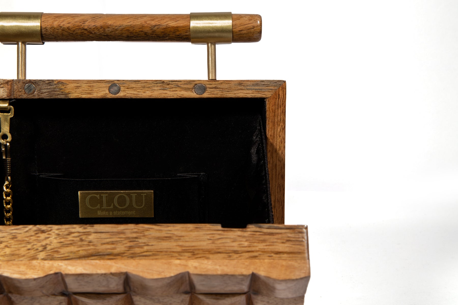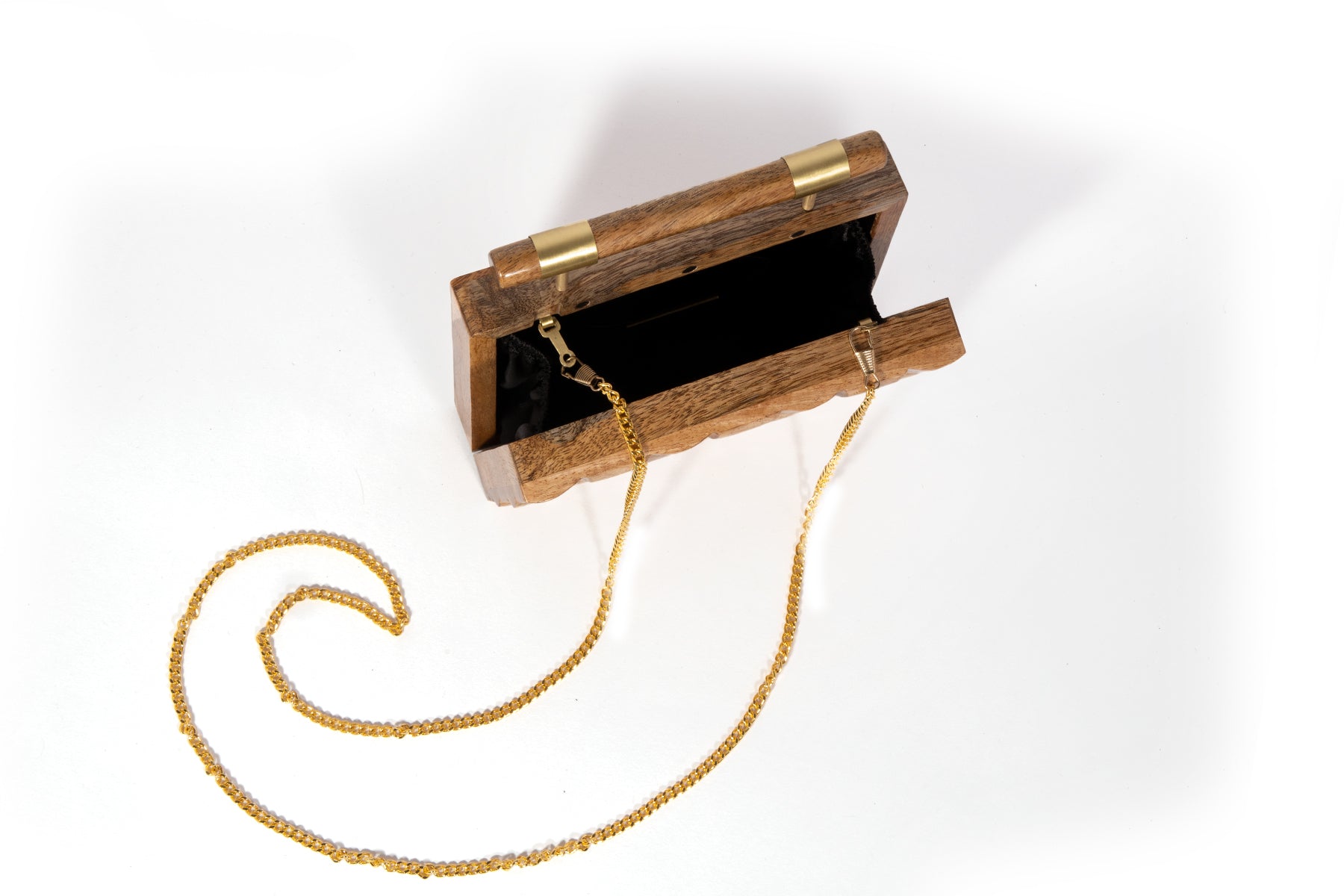 A sleek brown rectangle clutch with a stylish brass handle crafted from sustainable mango wood. This chic and versatile piece perfectly complements your flowy sun dresses and party dresses, adding a touch of sophistication and glamour to any outfit.