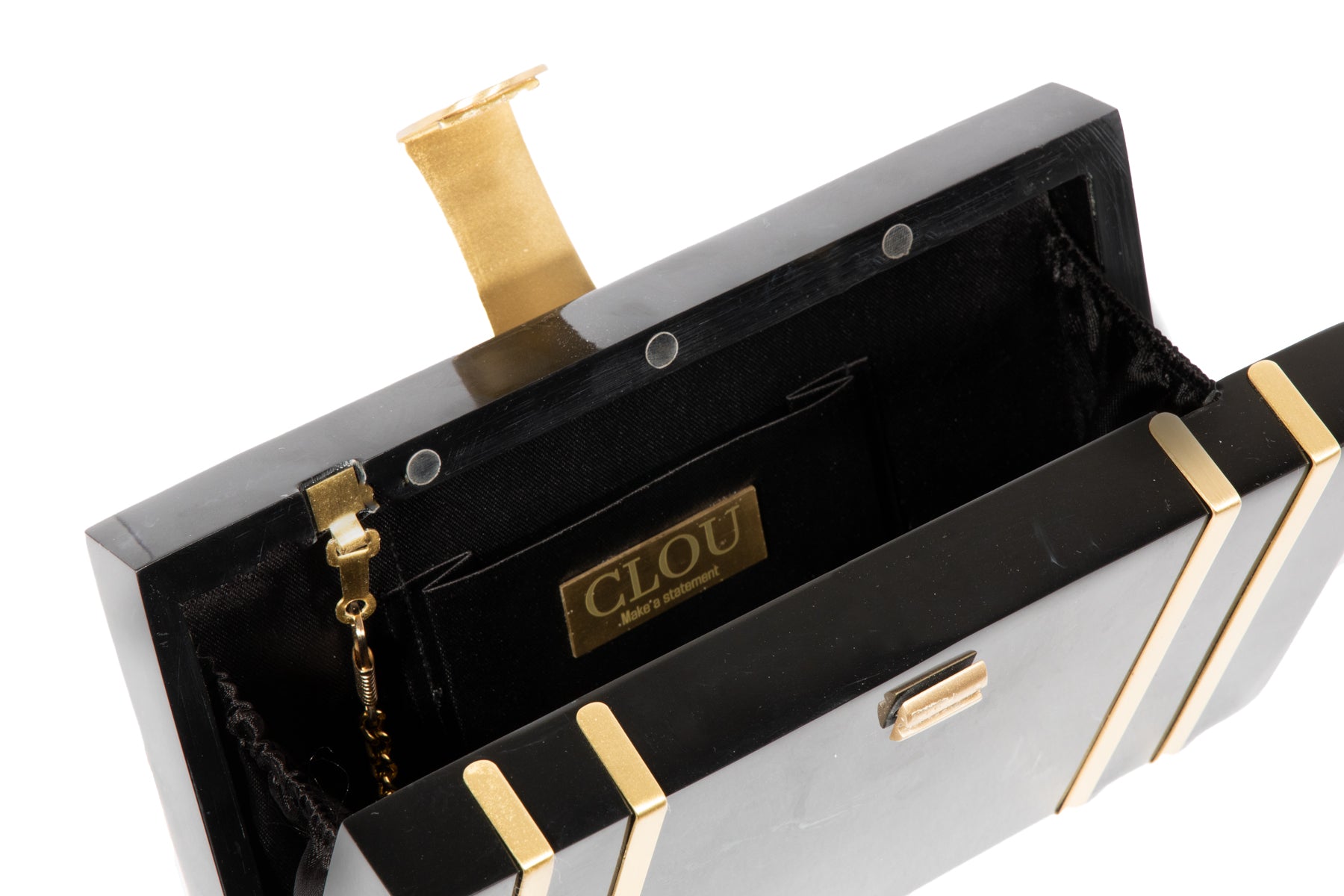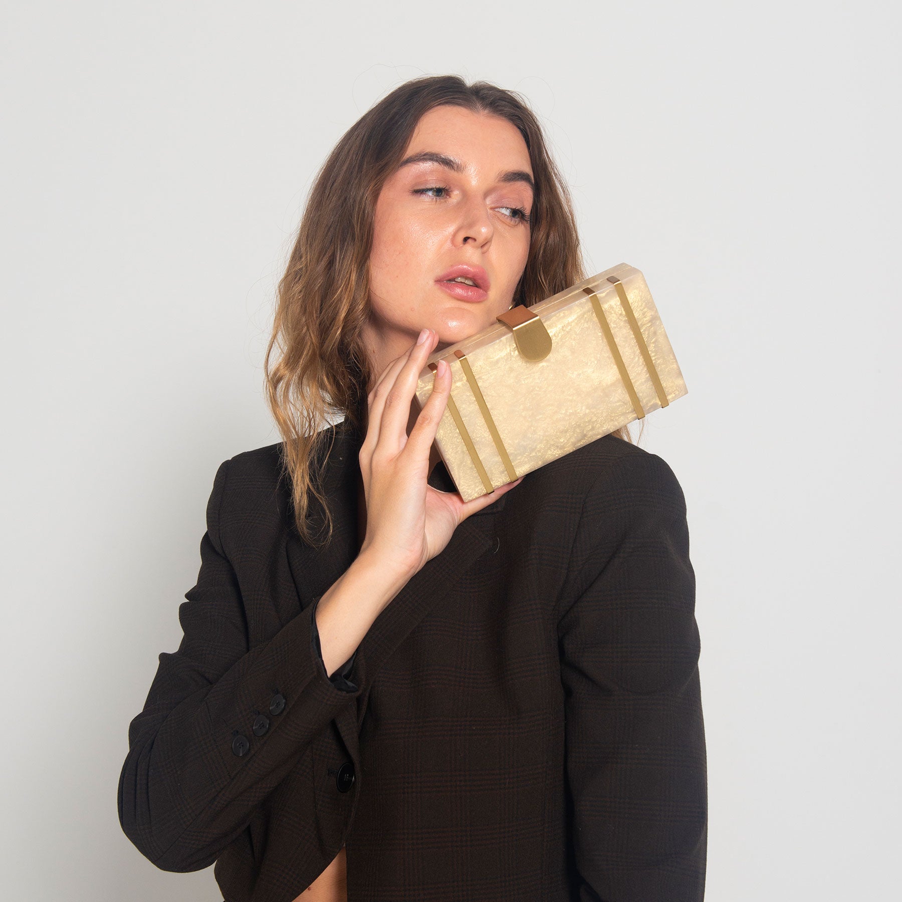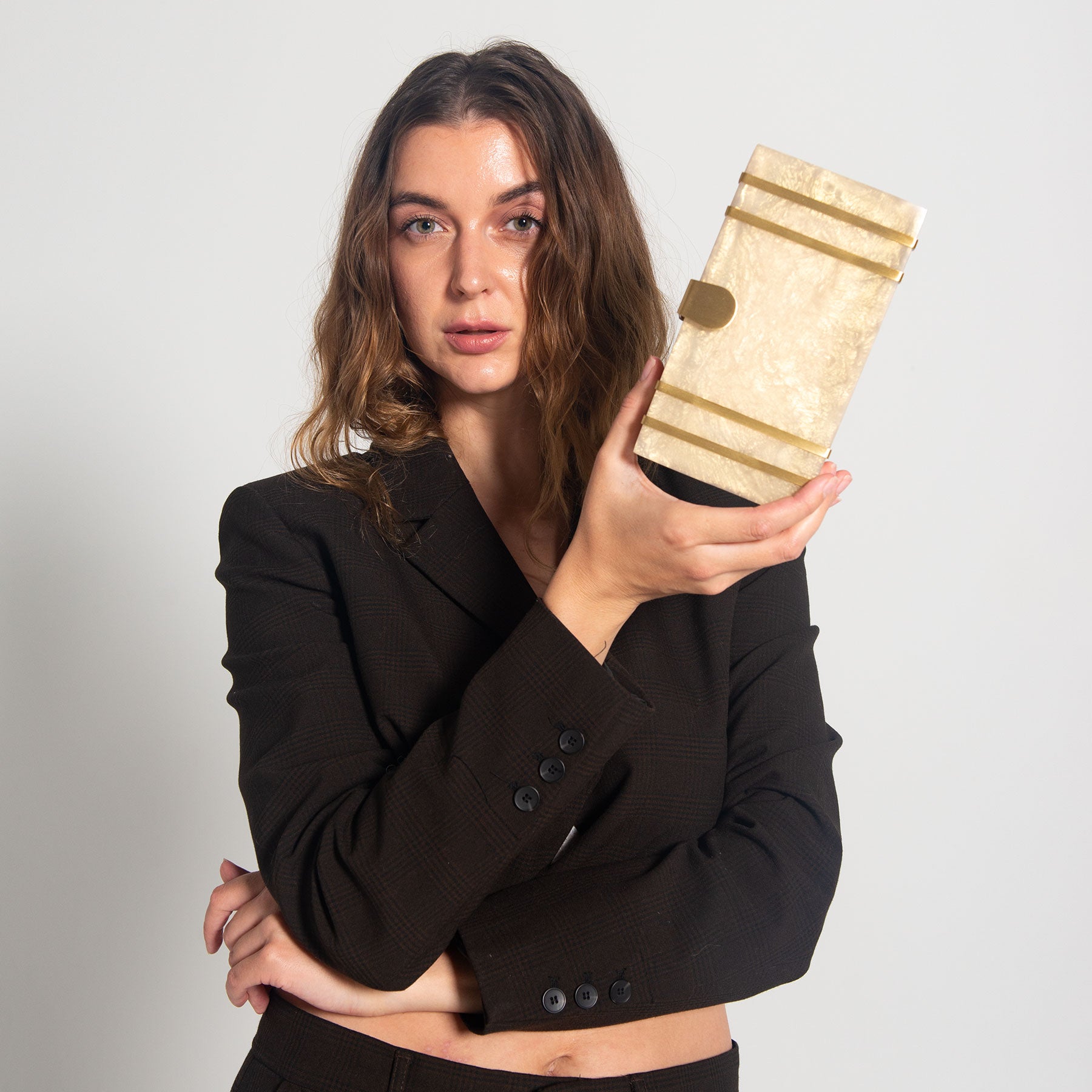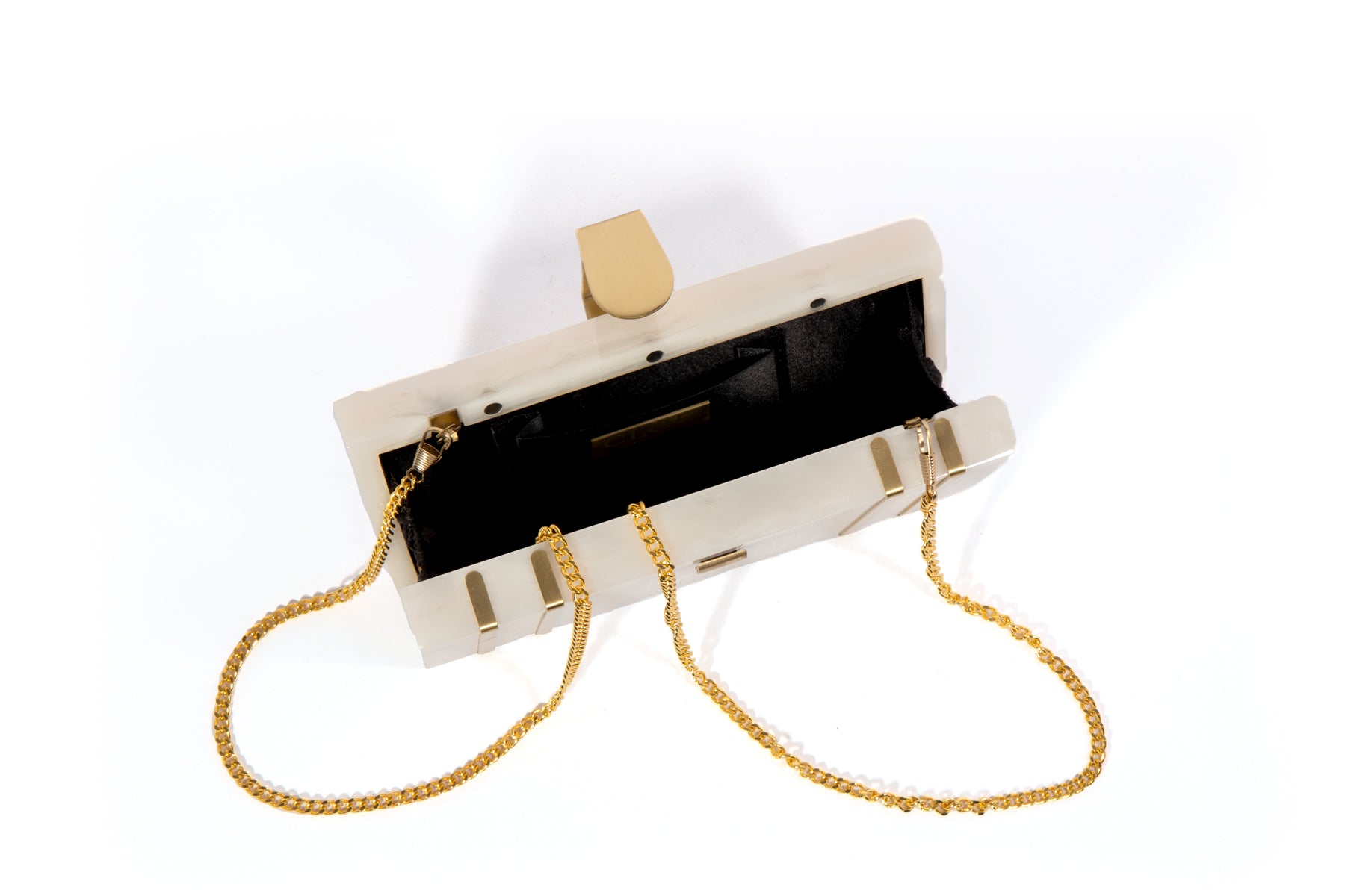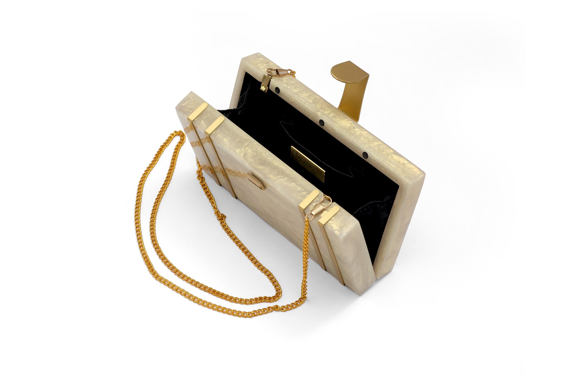 This exquisite rectangular resin clutch, featuring elegant brass strips and a sophisticated brass flap latch, is a testament to refined style and sophistication. Perfectly complementing your summer wedding dress, this masterpiece is a showstopping accessory for your special day. But its beauty and elegance don't stop there - it also makes a thoughtful and luxurious gift for your loved ones and girlfriends, perfect for birthdays, anniversaries, or any occasion that deserves a touch of glamour. Whether you're the bride or a beloved friend, this clutch is sure to impress and be treasured for years to comez.