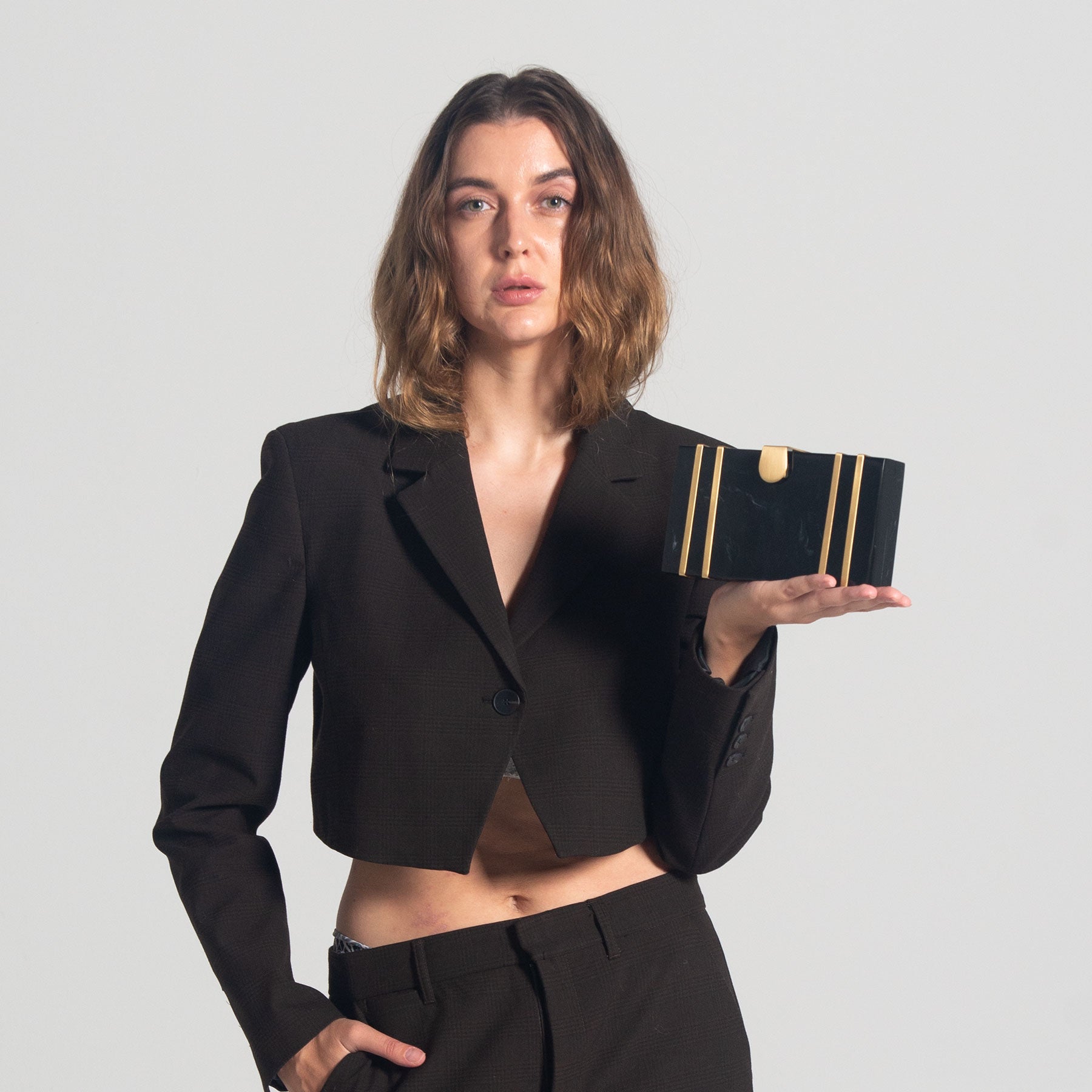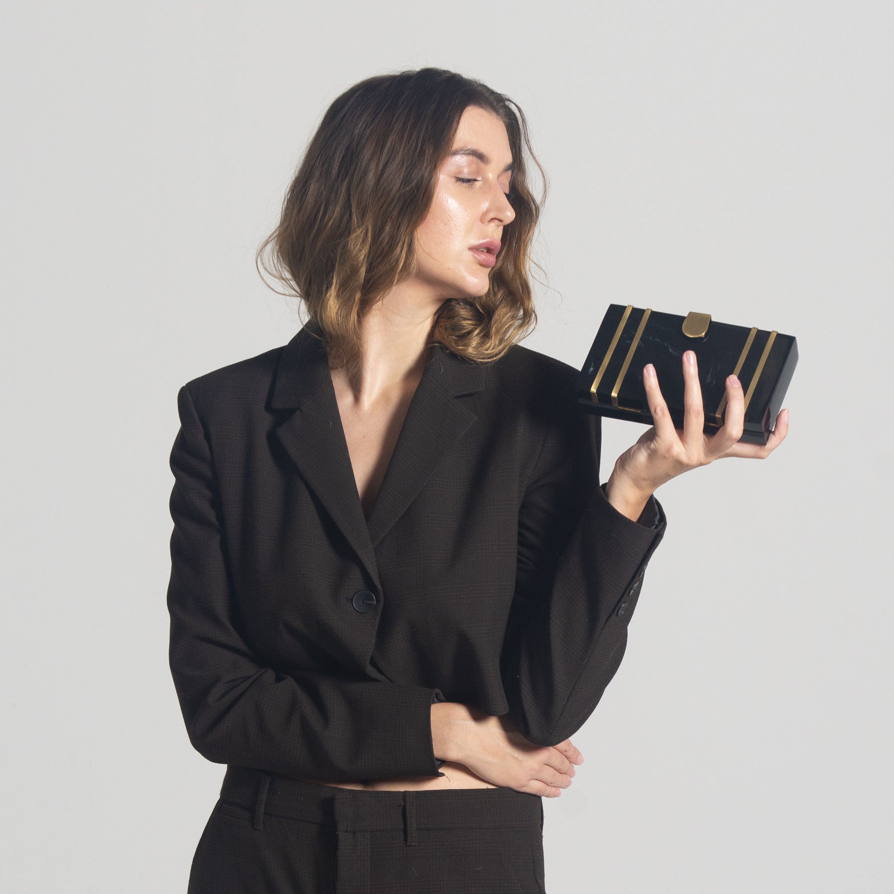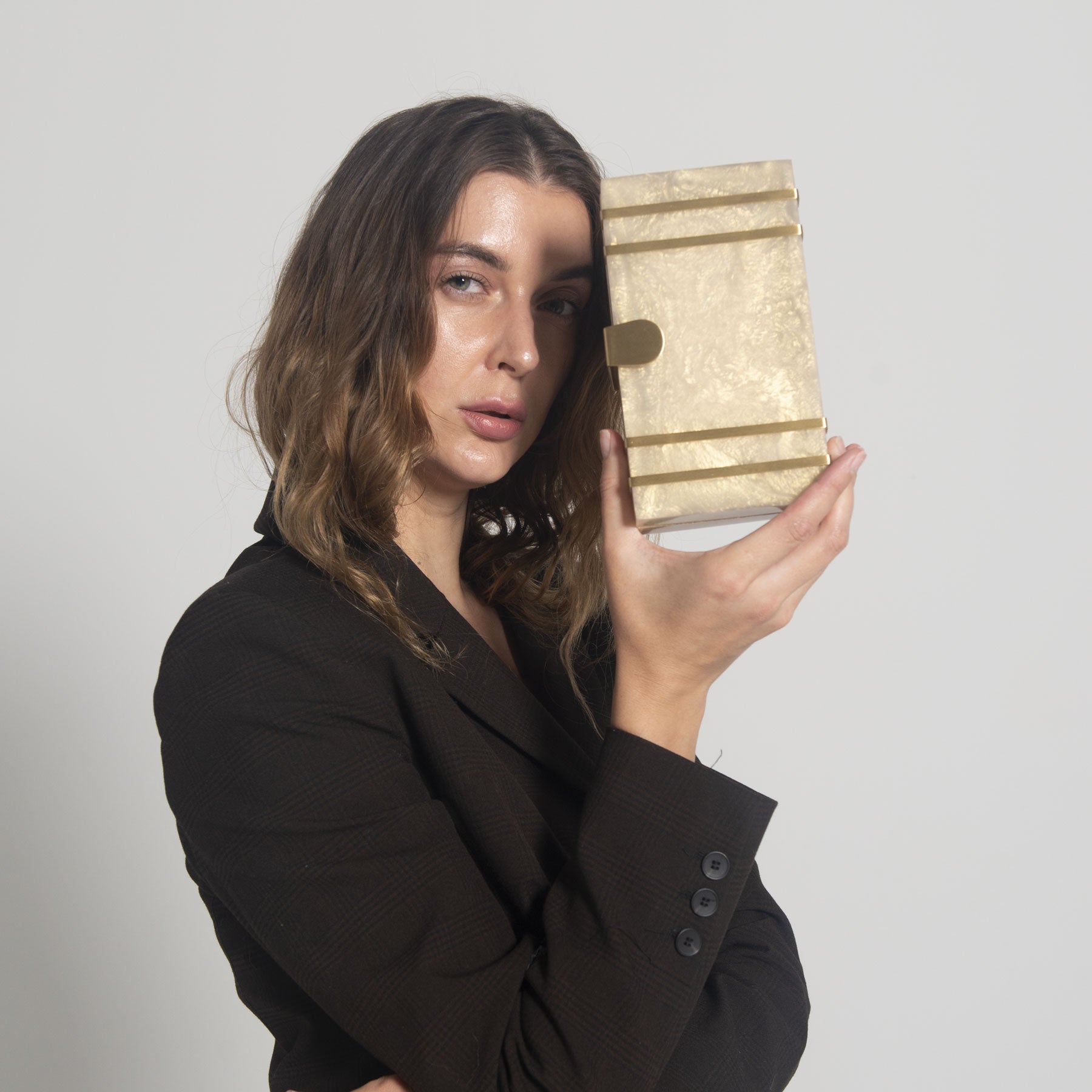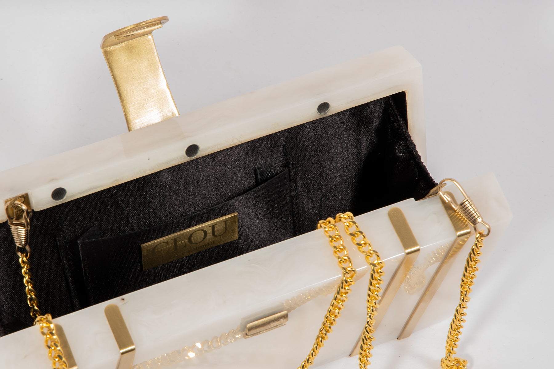 This exquisite rectangular resin clutch, featuring elegant brass strips and a sophisticated brass flap latch, is a testament to refined style and sophistication. Perfectly complementing your summer wedding dress, this masterpiece is a showstopping accessory for your special day. But its beauty and elegance don't stop there - it also makes a thoughtful and luxurious gift for your loved ones and girlfriends, perfect for birthdays, anniversaries, or any occasion that deserves a touch of glamour. Whether you're the bride or a beloved friend, this clutch is sure to impress and be treasured for years to comez.