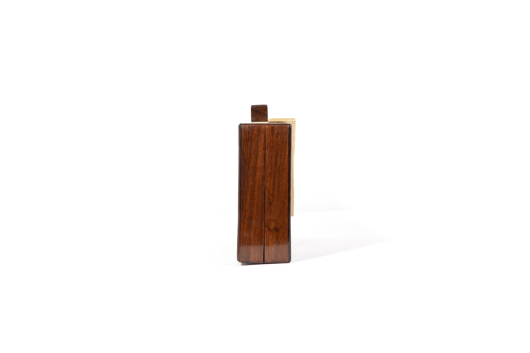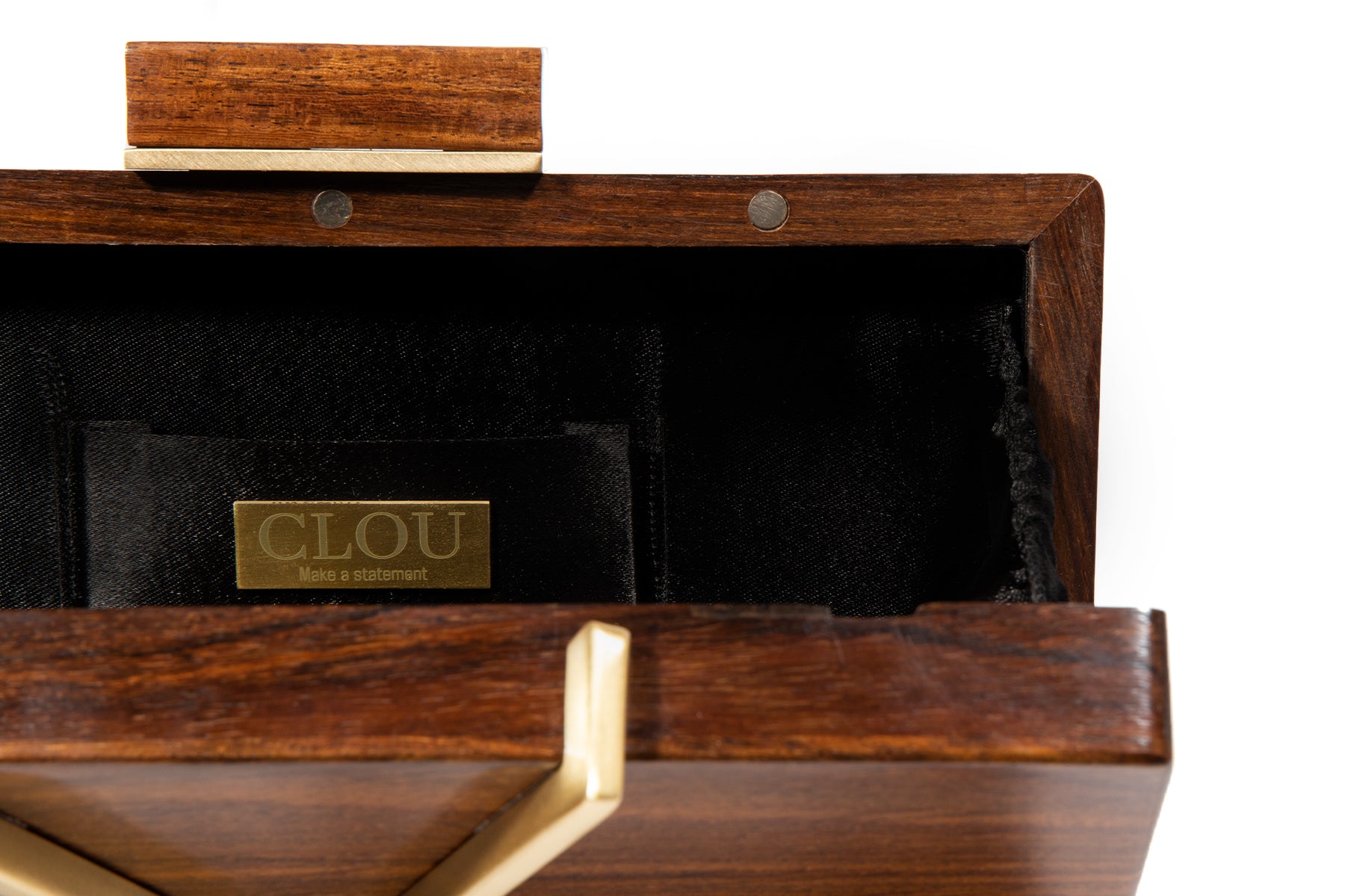 Elevate your style with this exquisite rectangular clutch, expertly crafted from rich rosewood and adorned with a sophisticated brass V-shaped design. The perfect fusion of luxury and elegance, this clutch adds a touch of refinement to any outfit. Pair it with a crisp white ensemble and neutral shades for a chic evening look or a luxurious brunch date. Its unique blend of natural beauty and metallic accents ensures a timeless and sophisticated accessory for any discerning fashionista.